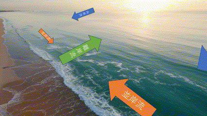 離岸流とは、陸に向かって流れる向岸流が岸にぶつかり左右に流れる並岸流となり、その並岸流同士がぶつかって発生する、沖に向かう流れのことです。